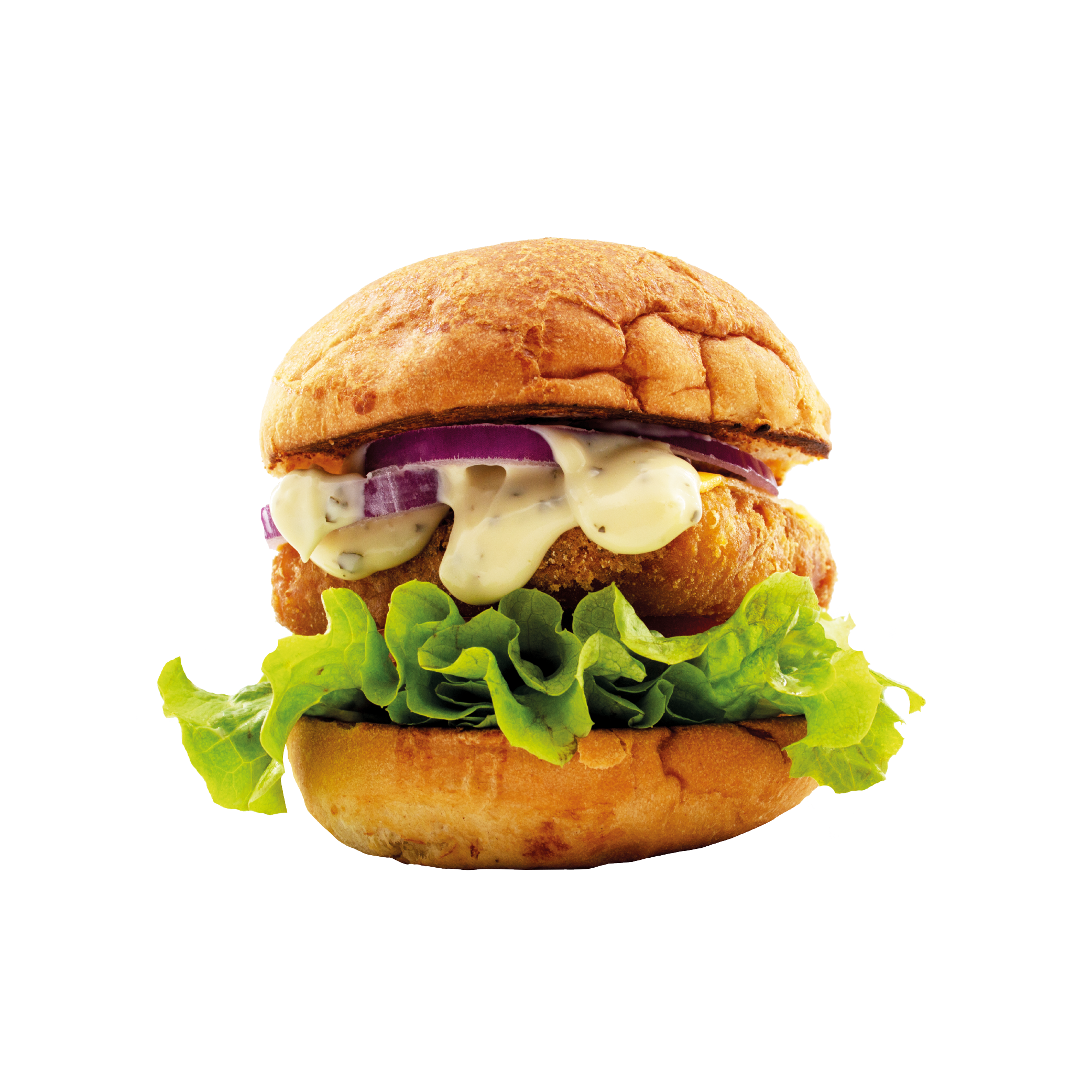 🍔 Sauce tartare, Filet de Colin pané façon Fish’N Chips, Salade, Tomates, Oignons rouges, Cheddar