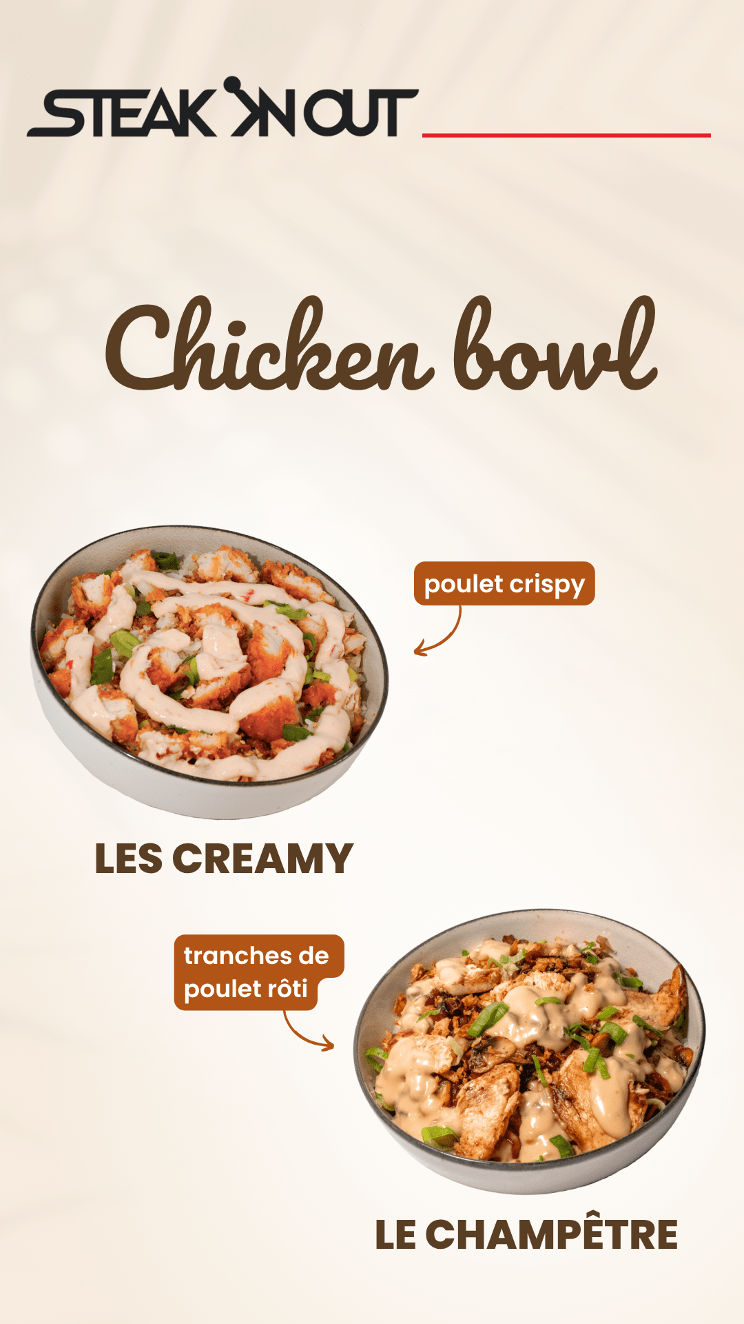 🍔 Riz parfumé, poulet crispy, cebette fraîche, oignons frits, graines de sésame, poivrons grillés, oignons caramélisés, sauce aigre douce ou soja sucrée